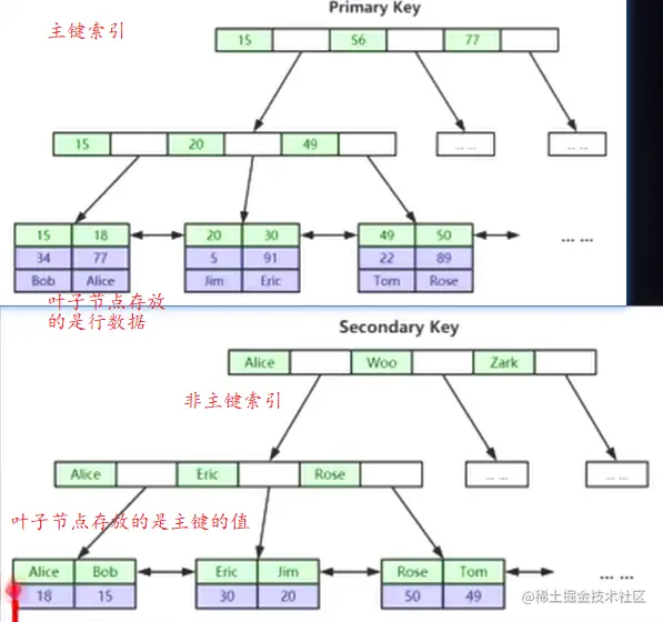如上图所示,在主键索引中,叶子节点包含了表中的所有字段,对于一些全表扫描的查询来说,直接扫描叶子节点便可以得到数据,不用再从索引树上挨个查找
