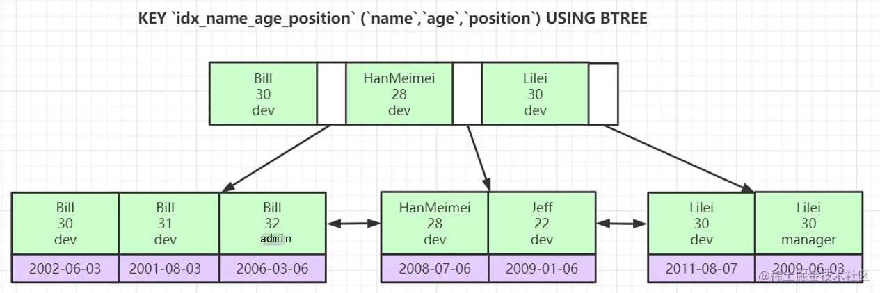 所以 name = 'Bill' and age = 20 and position = 'dev' 可以用到全部索引, 因为 name 确定了,age 是有序的,age 可以走索引, age 确定后 position 可以走索引。这个联合索引可以全部用到