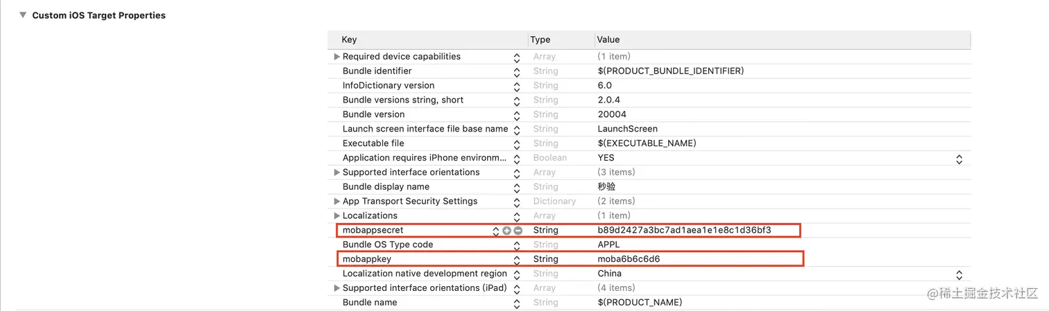 (1)在项目中的info.plist文件中添加键值对,键分别为 MOBAppKey 和 MOBAppSecret ,值为在之前在MobTech官网开发者后台申请的AppKey和AppSecret: