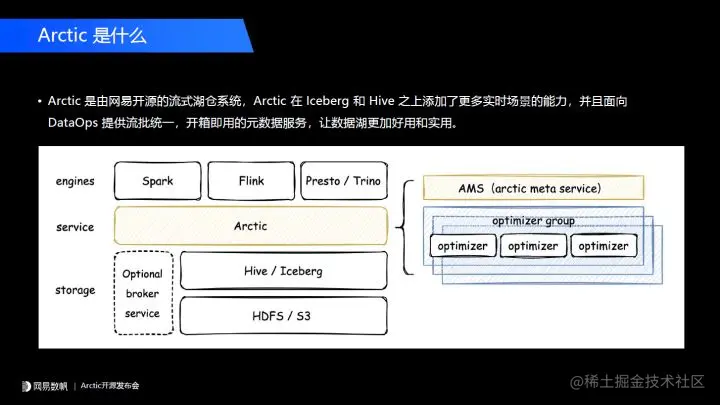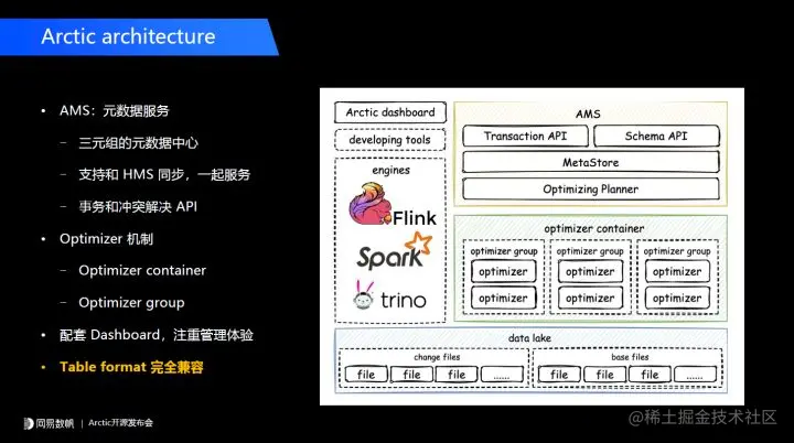 Arctic 本身包含两个核心组件,第一个是元数据服务 AMS,它在我们系统中定位是下一代 HMS 的角色。第二个,我们持续自优化的功能,会有整套 optimizer 组件和机制,来实现后台数据优化。
