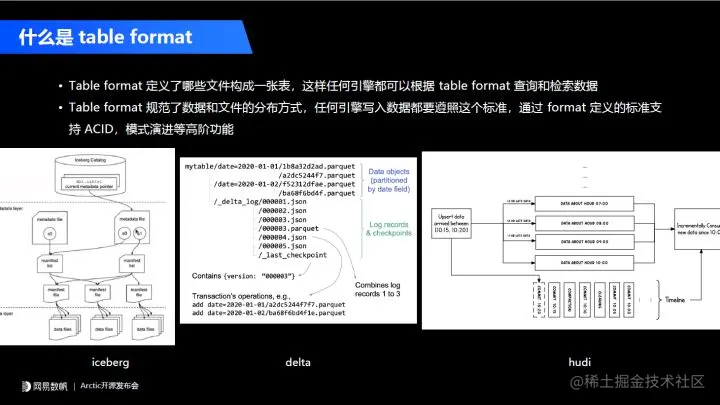 Table format 这个概念最早由 Iceberg 提出,现在行业对它的理解主要有两点。第一点是 Table format 定义了哪些文件可以构成一张表,这样 Apache Flink、Apache Spark、Trino、Apache Impala 等任何引擎都可以根据 Table format 去查询、检索数据。第二点就是 Table format 规范了数据和文件的分布方式,任何引擎写入数据都要遵照这个标准,通过 format 定义的标准来支持以前 Hive 不支持的 ACID 和模式演进。我们看到 Iceberg、Delta 和 Hudi 在这些功能上基本上是拉平的,虽然他们在各自实现上有很大不同,但抽象他们的共性个人认为是非常有意义的事情。