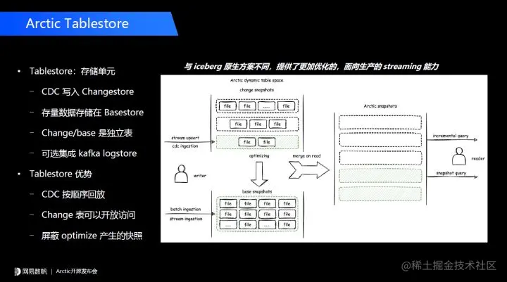我们之前和很多用户聊过 Arctic,大部分用户的第一个问题是我们跟开源的 Iceberg 具体是什么关系。通过这张图我想来说明这点。首先在 Arctic 中有 Tablestore 这个概念,Tablestore 是一个存储单元的定位,有点类似于传统数据库里面聚簇索引的概念。当流式写入的时候,我们会用一个 change 的 Tablestore 存储一个 CDC 写入的数据,这个数据有点类似于我们数据库中的 binlog 或者 relog,后面这个 change table 可以用于 CDC 的回放,也可以当作一个单独的表来访问。