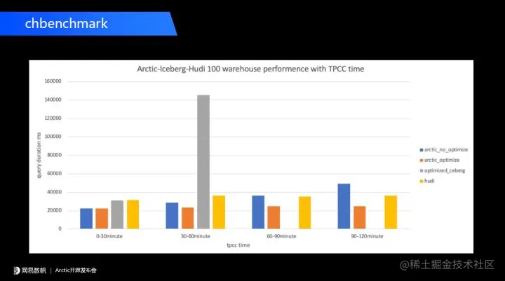 黄色部分是 Hudi。目前来看 Arctic 和 Hudi 一样,通过后台优化能够保证数据分析的性能,维持在一个比较平稳的数字。目前来看我们通过上层的优化,比 Hudi 要好一些。后续我们也会在官网中把我们整个测试流程和相关配置向大家公开。