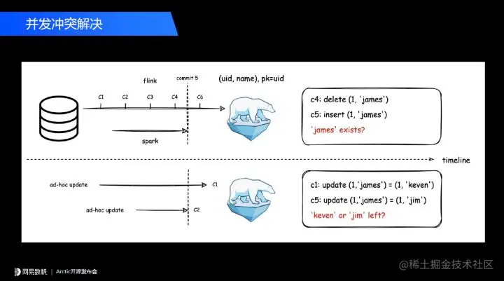 当我们采用了 Table format 去解决流批同源场景的时候,举个例子,比如下图上半部分,我们在做一个数据的 CDC 同步,正常情况下是一个 Flink 任务去做持续的同步,但是如果我们想做数据回滚或者要做数据更正,比如说添加了一列,这一列有个默认值,需要我们通过批的方式把数值初始化一下,会起一个 Spark 任务和 Flink 同步去跑。这个时候如果 Saprk 任务和 Flink 任务操作到了同一行数据,这个数据的主键是一样的,就会遇到数据冲突的问题。