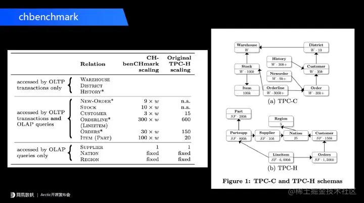 CHbenchmark 支持一个数据库既跑 TPC-C 也跑 TPC-H。从下图左边可以看到,有 6 张表是重合的,既在 TPC-C 中跑也在 TPC-H 中跑,有 3 张表是在 TPC-C 中引用,3 张表只在 TPC-H 中引用。