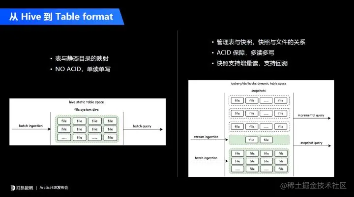 拿目前主流的数据湖 Table format 和 Hive 进行对比,Hive 简单定义了表和 HDFS 上静态目录的映射关系,它本身是没有 ACID 的保障的,我们在真实的生产场景中只能单读单写。目前我们上层的数据中台或者是 DataOps 平台能够通过工作流的方式保障我们能正确使用 Hive,当然只能用于离线场景。
