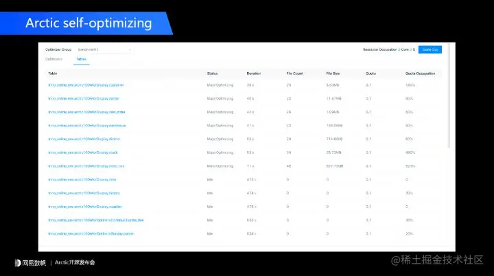 第四点数据优化的资源该怎样量化,怎样最大化利用这些资源。如果用户深入了解 Arctic,会发现我们 optimizing 跟目前 Hudi 其他的有很大不同,首先我们 optimizing 是在平台层面调度的,不是在每一个写入的任务里做的,这样我们可以集中化管理这些数据优化的资源,并且可以提供最快的迭代。比如我们发现通过一些优化能够让合并效率有很大的提升,就可以很快迭代。