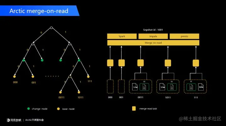 第三点我们这套设计理念 change 和 base 之间的转化,这个过程是 optimize。这个概念在 Delta、Iceberg 和 Hudi 中都有介绍过,它的核心是做一些小文件合并,我们把 change 数据到 base 数据的转换也纳入 optimize 的范畴,并且这些过程对用户来说是透明的,如果用户直接用 Iceberg 或者 Delta,所有的 optimize 操作在底层都会有一个快照,这样对用户是不友好的,我们在上层把这套东西封装起来了。当用户读一个高新鲜度的数据做分析时,我们的引擎端会做一个 change 和 base 的 merge-on-read。