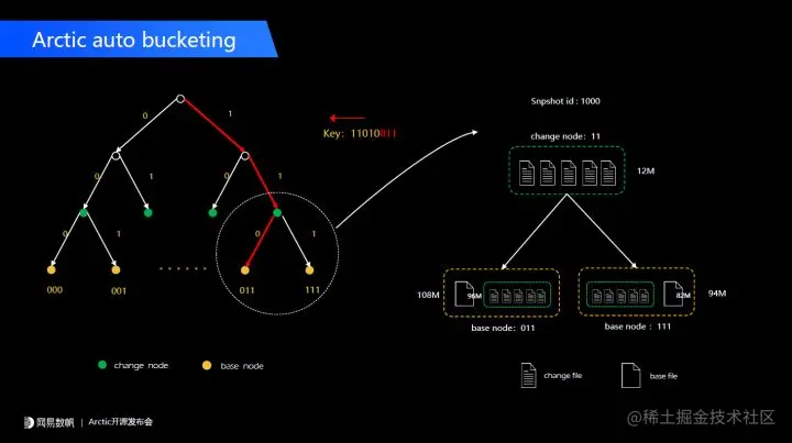 在 Iceberg 之上我们做了 auto bucketing 的功能,这个功能跟 Hudi 中 file_group 的概念有些类似。不同的是我们没有给用户暴露 file_group 或者 file_index 这样的概念。我们在文件之上提供了分组的功能,是一种可扩展的方式,通过二叉树的扩展方式让每一个节点的数据量尽可能维持在用户配置的大小。比如说 Iceberg 默认配置 128 兆,我们通过后台的一整 optimizing 套机制,会尽可能维护每个 node 的大小向 128 兆靠拢。