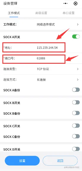 说明 地址为服务器地址,端口号为服务器端口号,若无自己的物联网服务器,可选择地址:prod.iotn2n.com,端口号设为20456 警告 设置dtu时,工作模式设置完后需保存再设置串口,不能一次性设置,一次性设置会导致设置不完全