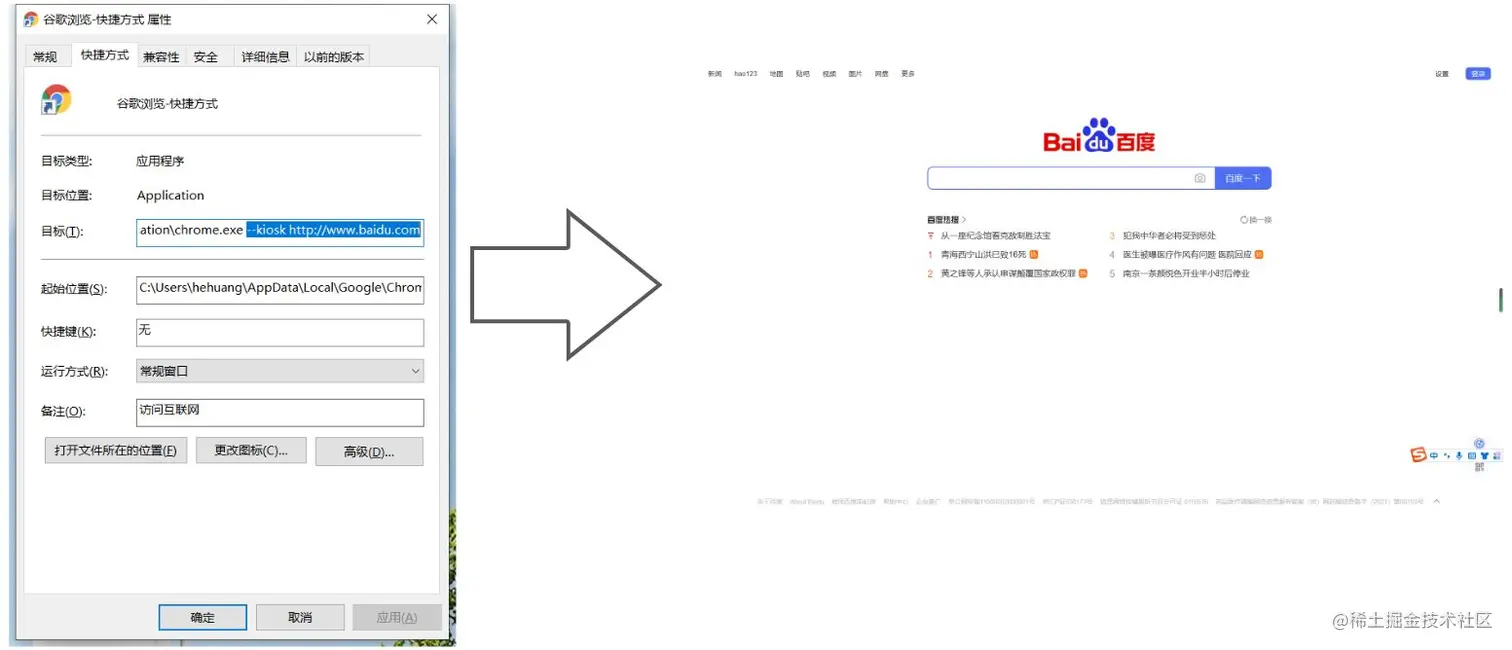 --kiosk参数,达到全屏效果。 - 设置系统开机自启动项:每次开机时,自动打开这个快捷方式。
