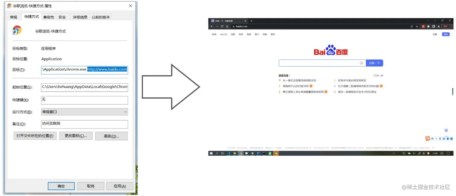 - 创建一个谷歌浏览器快捷方式,并指定这个快捷方式的默认启动页面。