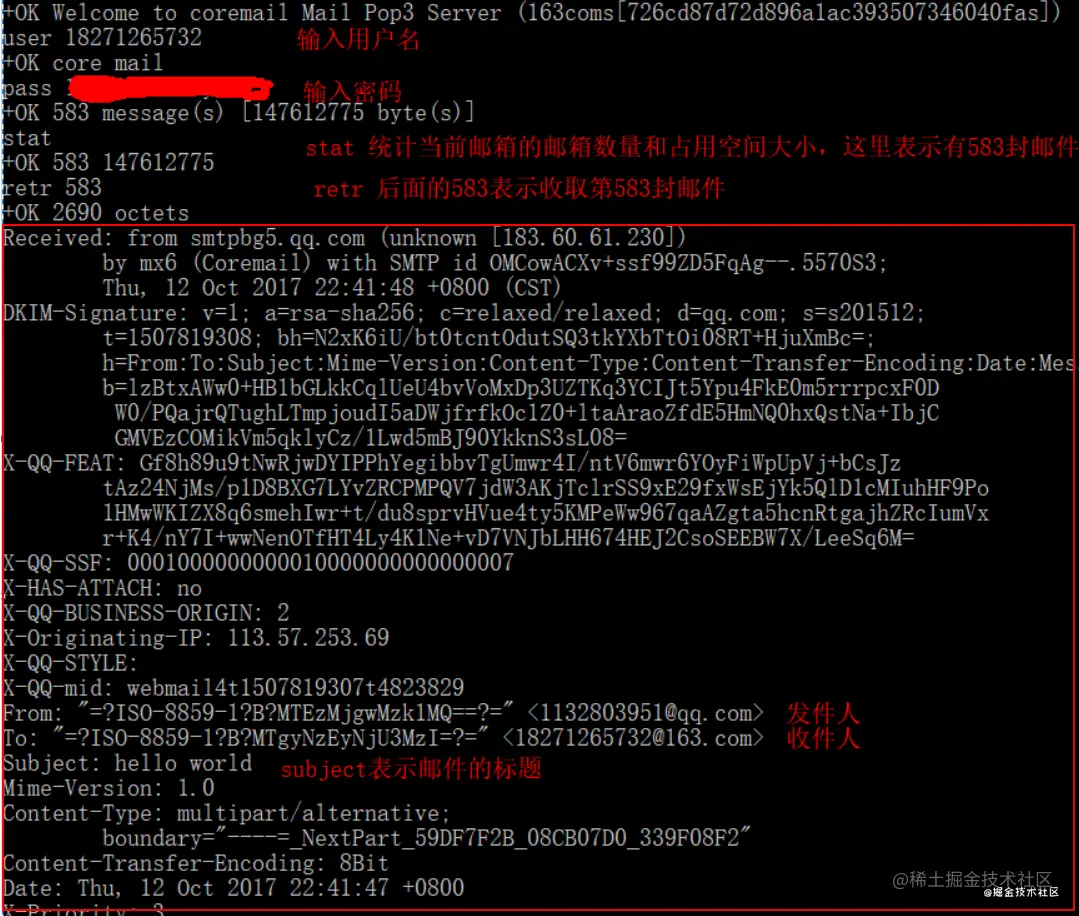 RFC822 文档中定义的文件格式包括两个部分:邮件头和邮件体。在上一篇博客,我们通过SMTP服务发送一封邮件,然后用POP3服务器接收。邮件接收内容如下图红色框所显示:
