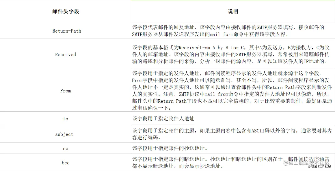 上面便是 RFC822 所定义的邮件格式,从第 1 行到第 30 行都是邮件头,第 31 行是邮件体(经过base64加密过了,有兴趣的大家可以解码看看)。而邮件头和邮件体之间以一个空行间隔,邮件头部分是由多个头字段和字段内容组成,分别表示收件人,发件人,发件时间,主题等信息。还有一些信息是对应的SMTP服务器在邮件传递过程中所加上的,我们知道现实生活中的邮局在处理邮件时,通常都会在信封上加上邮戳,表示这封邮件在什么时候经过了哪个邮局哪个部门处理,我们上个例子是QQ邮箱发给163邮箱的。而SMTP服务器按从下往上的方式添加信息,即先添加的字段位于后添加字段的后面。所以qq的SMTP服务器会先添加头字段,但是添加的字段会在163的SMTP服务器添加字段的下面,另外 POP3服务器也会自己添加一些字段。