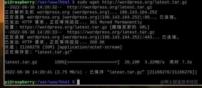 完成这一步后,我们就能下载wordpress的压缩文件。输入命