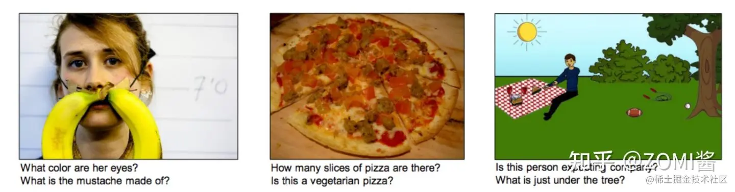 - 视觉问答(Visual Question Answering,VQA) :根据给定的图片提问,从候选中选择出正确的答案,VQA2.0 中从 COCO 图片中筛选了超过100万的问题,训练模型来预测最常见的3129个回答,其本质上可以转化成一个分类问题。