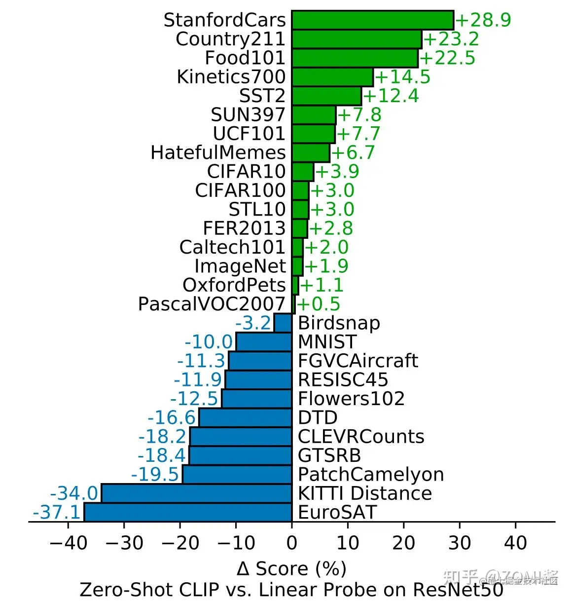 CLIP 的 zero-shot 精度虽然总体上比 supervised baseline ResNet-50 要好,但其实在很多任务上比不过 SOTA methods,因此 CLIP 的 transfer learning有待挖掘。
