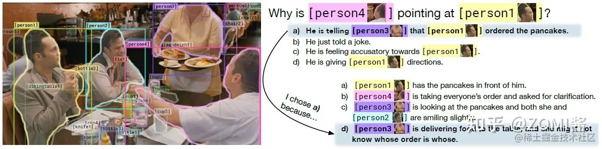 - 视觉推理(Visual Reasoning,VR) :视觉推理相对视觉问答更为复杂, 其可以分解为两个子任务视觉问答(Q->A)和选出答案的原因(QA->R), 除了回答的问题需要用自然语言表达具有挑战性的视觉问题外, 模型还需要解释为什么作出这样的回答, 其最开始由华盛顿大学提出, 同时发布的 VCR 数据集包含 11 万的电影场景和 29 万的多项选择问题。