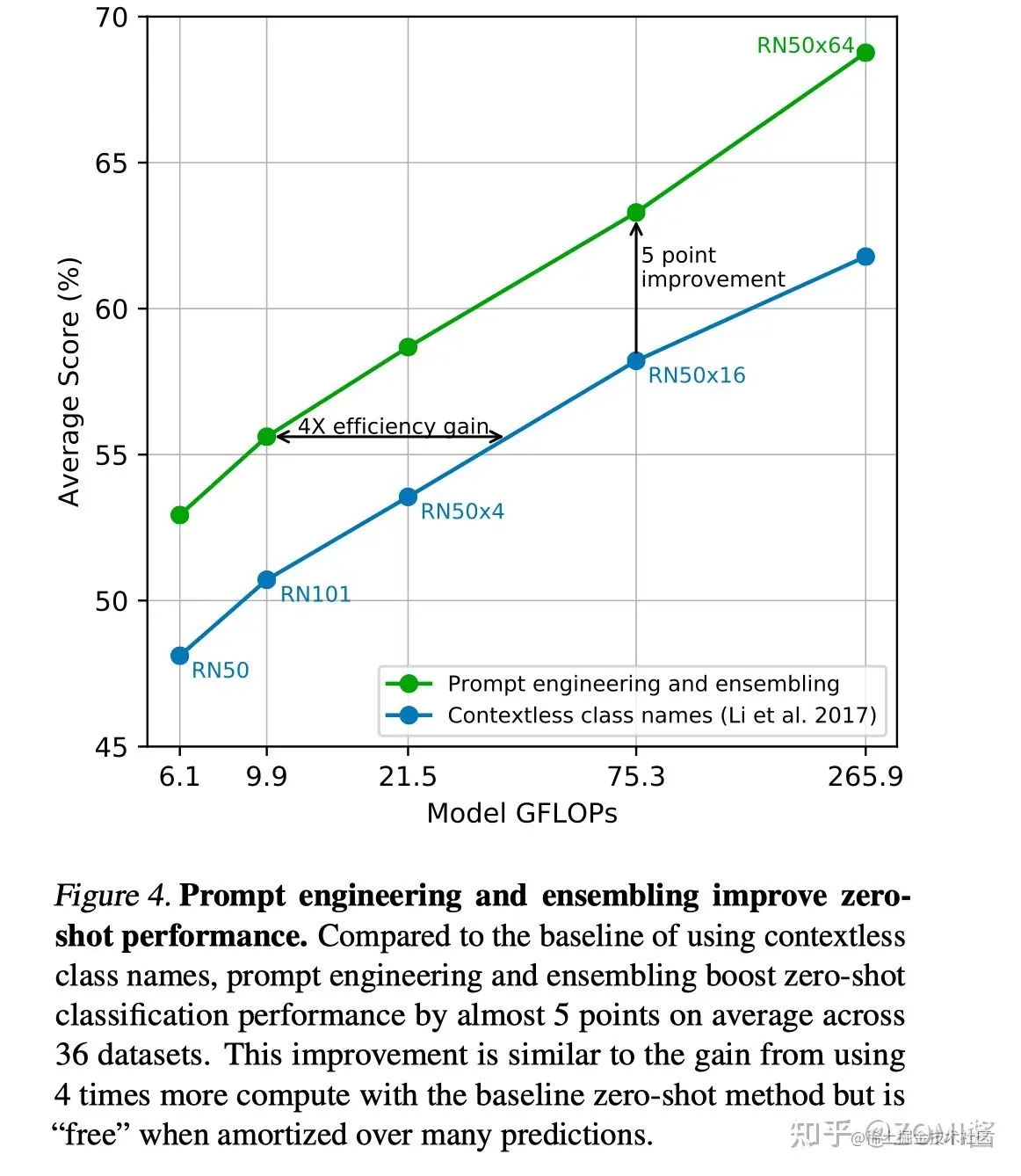 可以从实验结果发现,采用 Prompt engineering + ensembling 的效果比只用没有上下文的类别名好得多。