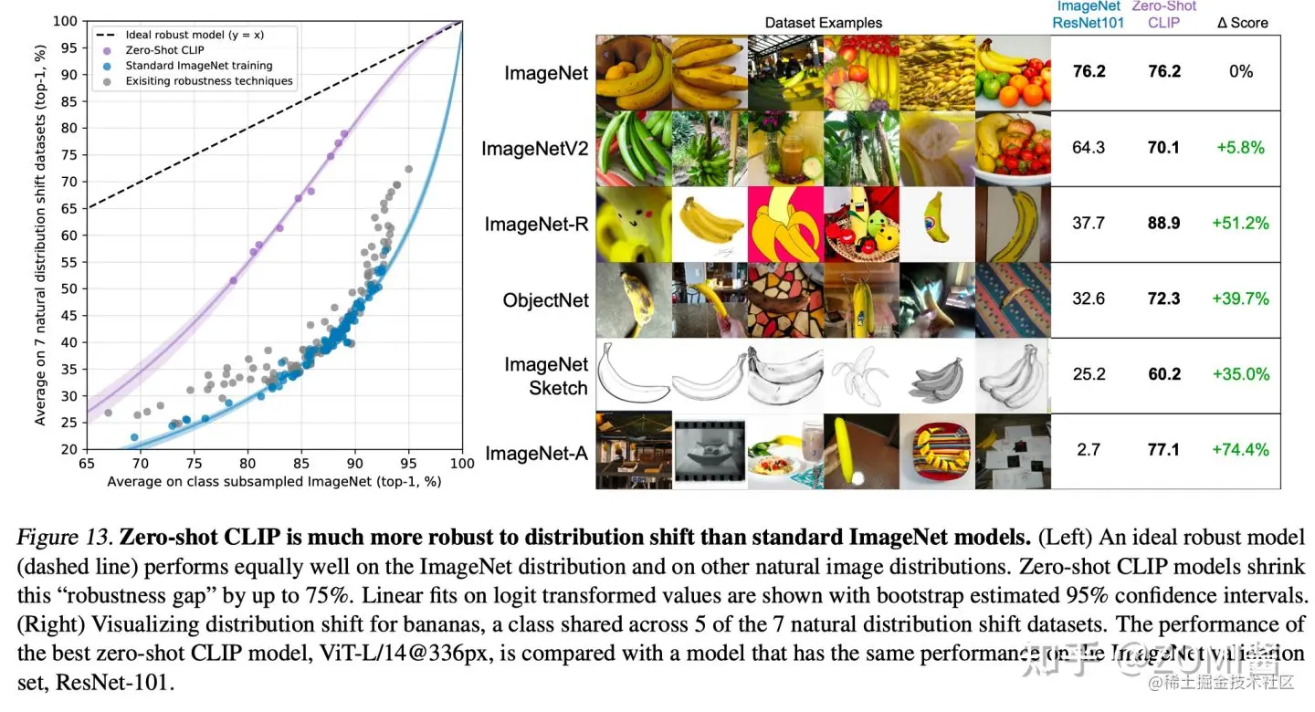 从图中可以看到,在不同的数据集上,CLIP 对比通用的 ResNet50 精度超过的有16/27,已经很强了,因为CLIP是zero-shot的,即没有用下游任务的数据,而linear probed ResNet50用了下游数据进行finetune逻辑回归分类器的参数。