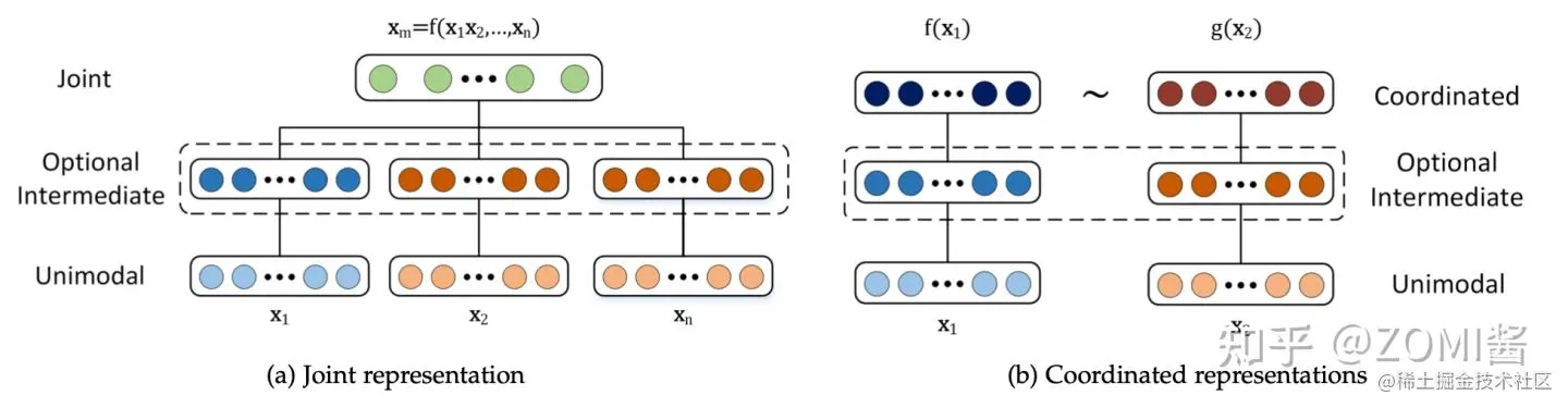 协同表示(Coordinated Representations) :将多模态中的每个模态分别映射到各自的表示空间,但映射后的向量之间满足一定的相关性约束(例如线性相关)。\