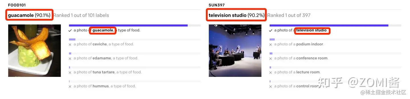 在推理阶段,无论来了张什么样的图片,只要扔给 Image Encoder 进行特征提取,会生成一个一维的图片特征向量,然后拿这个图片特征和 N 个文本特征做余弦相似度对比,最相似的即为想要的那个结果,比如这里应该会得到 “A photo of a guacamole.”,