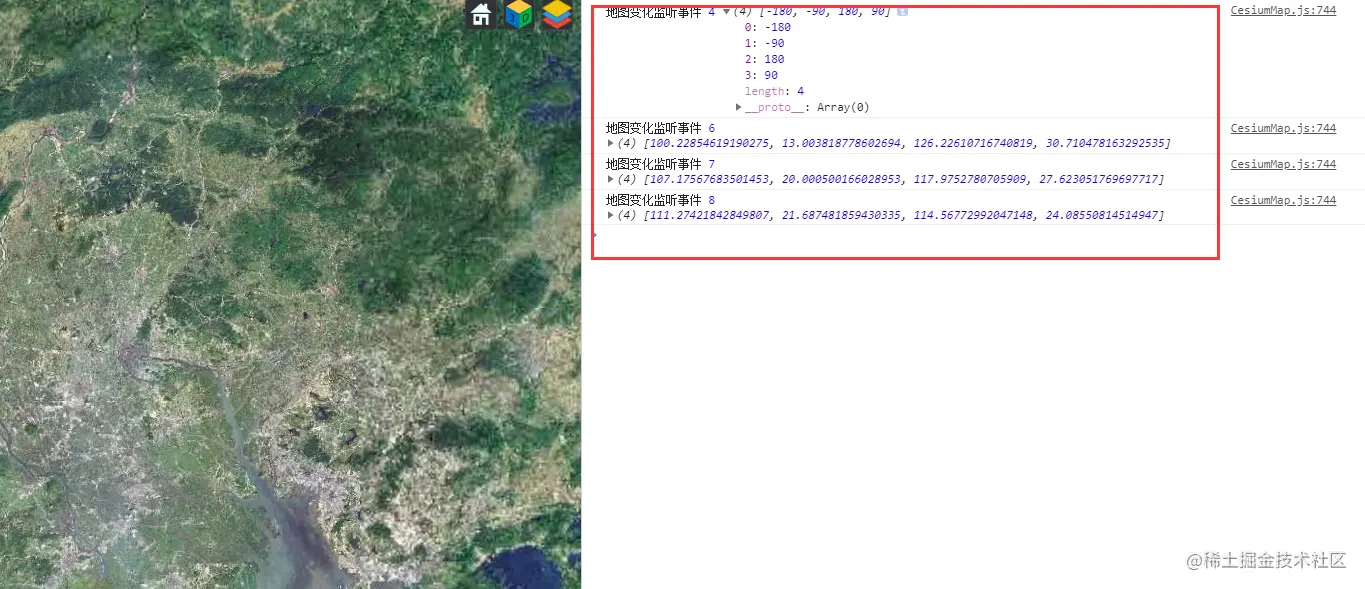 //监听地图移动完成事件 this.viewer.camera.moveEnd.addEventListener(this.onMoveendMap); //监听地图移动完成事件 onMoveendMap = () => { const me = this; //获取当前相机高度 let height = Math.ceil(me.viewer.camera.positionCartographic.height); let zoom = me.heightToZoom(height); let bounds = me.getCurrentExtent(); console.log('地图变化监听事件',zoom,bounds); };