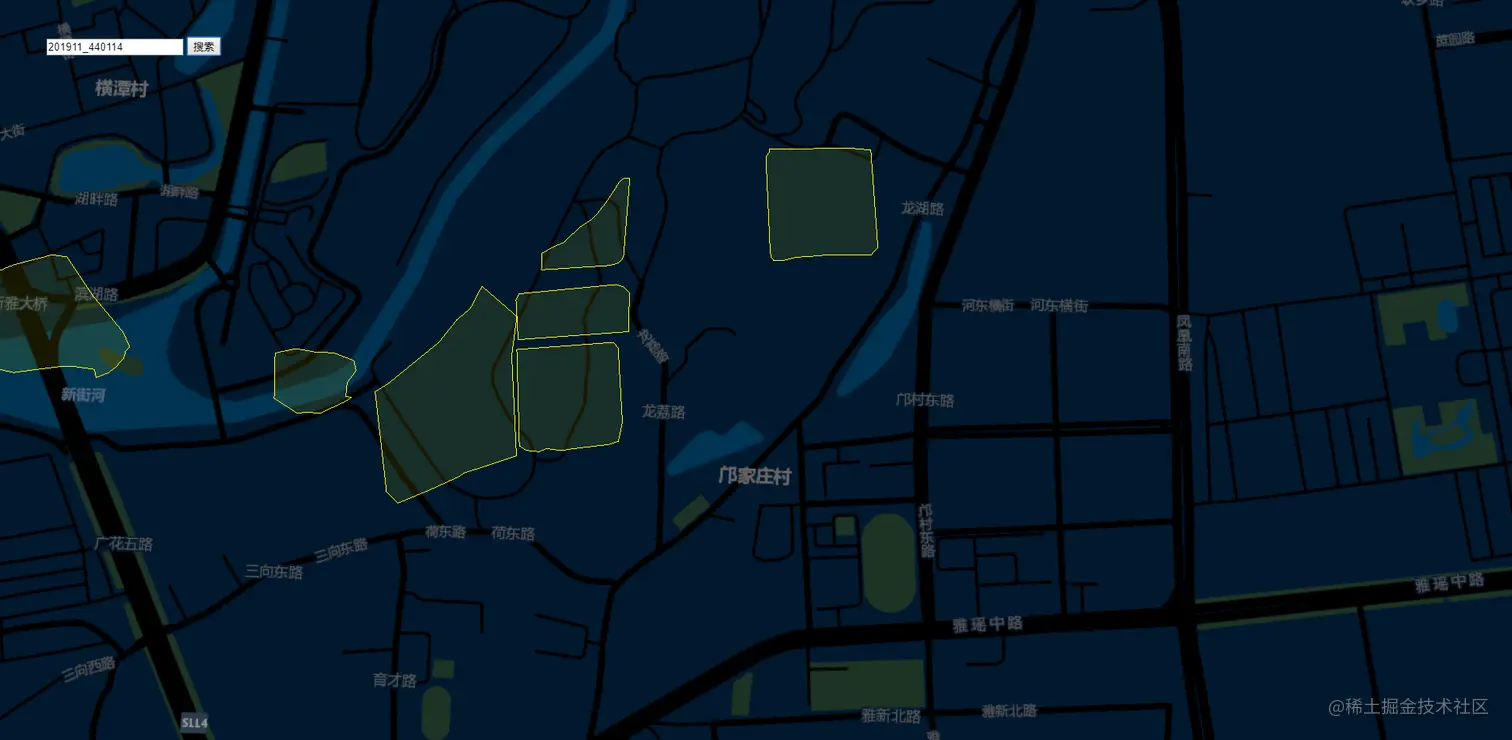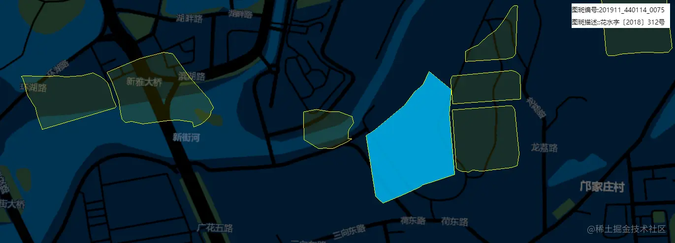实现思路:首先利用 geoserver 发布的图斑 WFS 服务,通过 url 的 rest 请求,构造属性查询形式,获取 geojson 数据源;然后调用cesium api 的 Cesium.GeoJsonDataSource.load 加载 geojson 数据源渲染展示;最后监听地图点击事件,获取矢量数据的属性,显示在右上角的信息窗口。