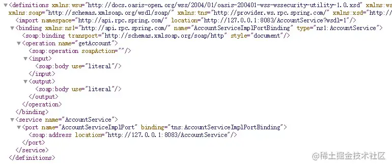 完成如上代码,其实我们已经构建了一个完整的WebService服务,而且还加上了用户、密码和ip白名单等接口权限认证,访问:http://localhost:8083/AccountServiceImpl?WSDL 就可以看到服务的定义,如下:
