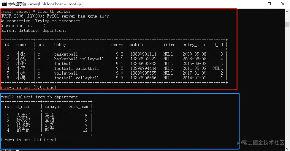 select name,sex,hobby,score,d_name,manager,work_num from tb_worker inner join tb_department on tb_worker.id=tb_department.id;