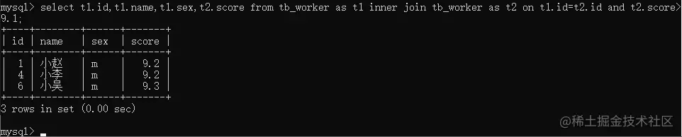 select t1.id,t1.name,t1.sex,t2.score from tb_worker as t1 inner join tb_worker as t2 on t1.id=t2.id and t2.score>9.1;