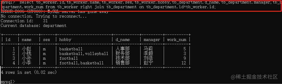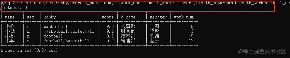 select hobby,score,d_name,manager,work_num from tb_department inner join tb_worker on tb_worker.id=tb_department.id;