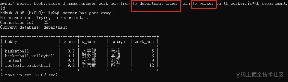 select hobby,score,d_name,manager,work_num from tb_worker inner join tb_department on tb_worker.id=tb_department.id;