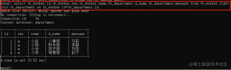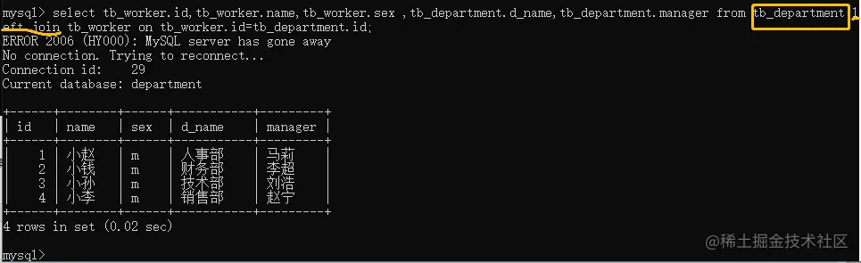 2:如果我们把左表改成tb_department ,就会出现这样的结果,不会返回空值。
