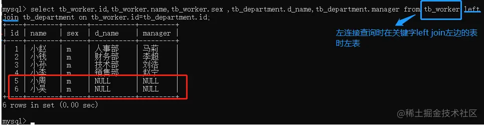 我们以tb_worker为左表,那么左表就是查询过程中的基表,左表需要查询的字段会保留 , 另一张表中的数据如果不符合连接条件的话就会返回空值NULL。