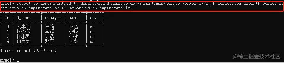 select tb_worker.id,tb_worker.name,tb_worker.sex,tb_department.d_name,tb_department.manager from tb_worker left join tb_department on tb_worker.id=tb_department.id;