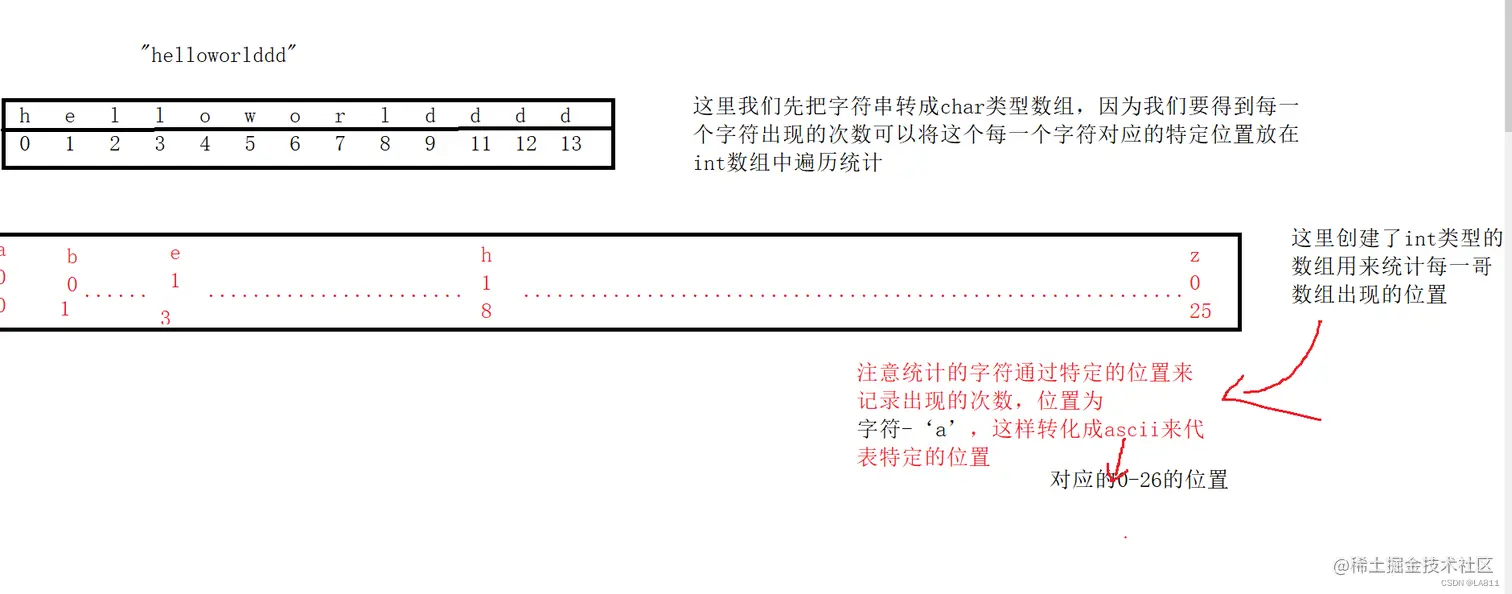 思路一:将对应位置的字符存放在对应的int类型的数组中并记录他出现的次数