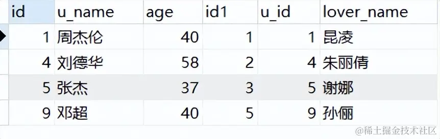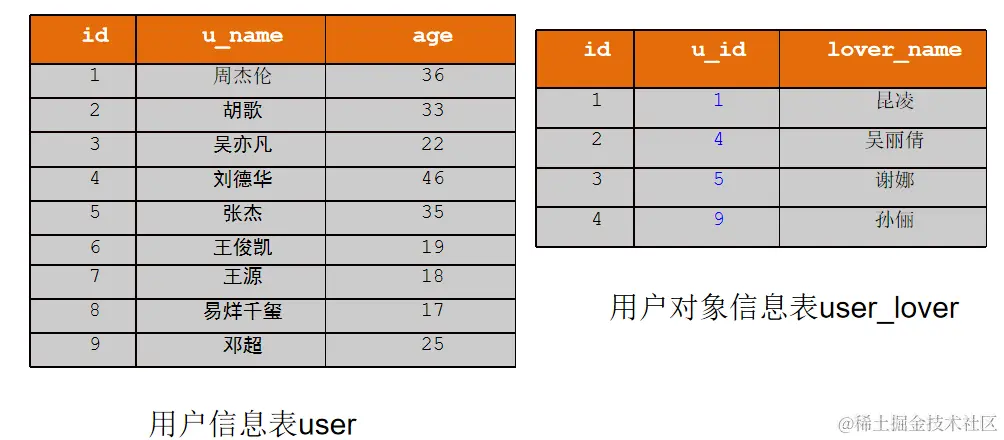 - 以上左表user表,右表为左表的对象信息user_lover表,查询两表中存在对象关系的信息