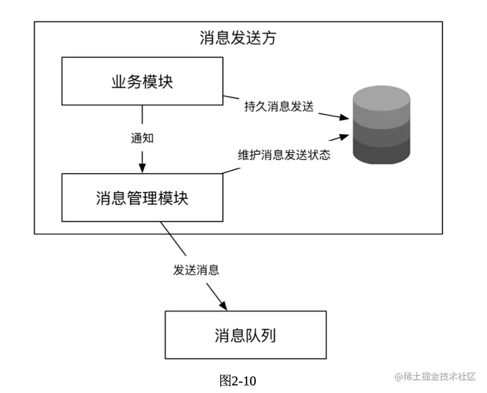 - 第1种,在发送消息之前将消息持久到数据库,状态标记为待发送,然后发送消息,如果发送成功,则将消息改为发送成功。定时任务定时从数据库捞取在一定时间内未发送的消息并将消息发送。可靠消息发送模式1如图2-10所示。