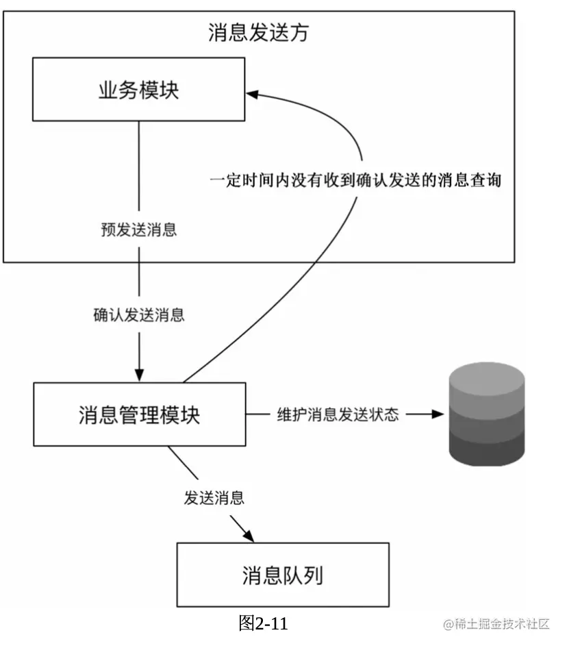 - 第2种,该实现方式与第1种类似,不同的是持久消息的数据库是独立的,并不耦合在业务系统中。发送消息前,先发送一个预消息给某个第三方的消息管理器,消息管理器将其持久到数据库,并标记状态为待发送,在发送成功后,标记消息为发送成功。定时任务定时从数据库中捞取一定时间内未发送的消息,查询业务系统是否要继续发送,根据查询结果来确定消息的状态。可靠消息发送模式2如图2-11所示。