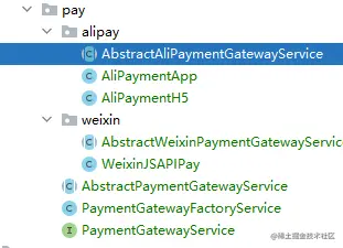 这里的逻辑就是一个支付抽象接口总类 AbstractPaymentGatewayService,后续根据支付总类型划分各个类型的抽象类 例如阿里支付、微信支付 对应的就是AbstractAliPaymentGatewayService、AbstractWeixinPaymentGatewayService