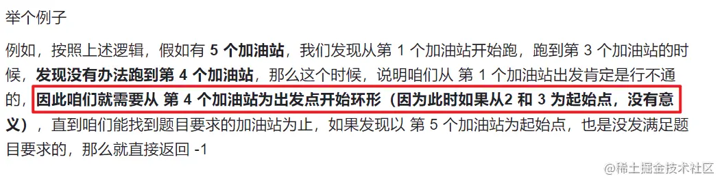 例如,按照上述逻辑,假如有 5 个加油站,我们发现从第 1 个加油站开始跑,跑到第 3 个加油站的时候,发现没有办法跑到第 4 个加油站,那么这个时候,说明咱们从 第 1 个加油站出发肯定是行不通的,因此咱们就需要从 第 4 个加油站为出发点开始环形(因为此时如果从2 和 3 为起始点,没有意义) ,直到咱们能找到题目要求的加油站为止,如果发现以 第 5 个加油站为起始点,也是没发满足题目要求的,那么就直接返回 -1
