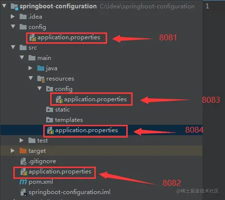./config/( 项目根路径下的 config 文件夹) 下图中的 8081./(项目根路径) 下图中的 8082classpath:/config/(类路径下的 config 文件夹) 下图中的 8083classpath:/(类路径) 下图中的 8084