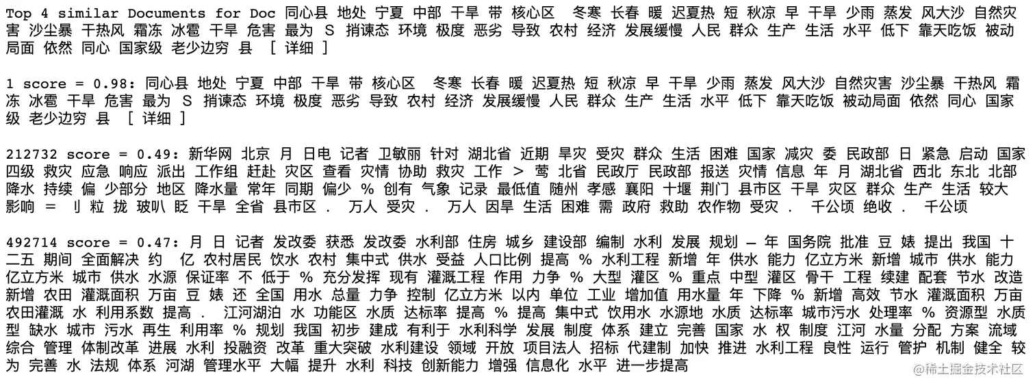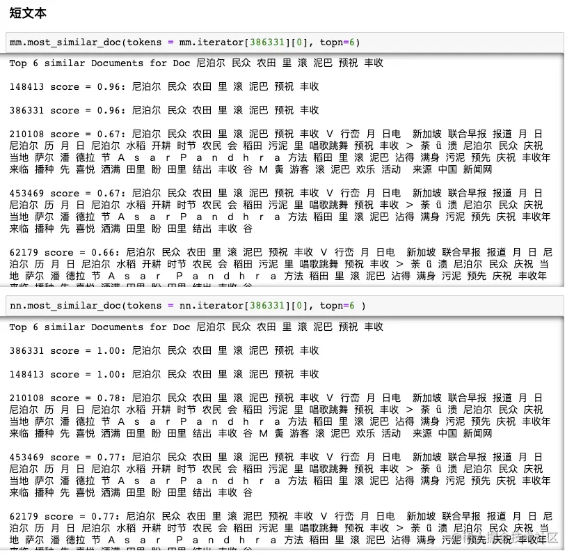 我们对比下Doc2vec和Word2vec得到的文本向量,在召回相似文本上的表现。先看短文本,会发现word2vec和doc2vec表现相对一致,召回的相似文本一致,因为对短文本来说上下文信息的影响会小。
