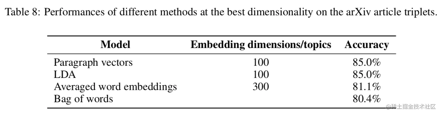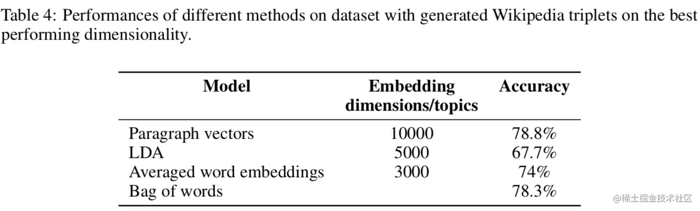 对此更有说服力的应该是Google【Ref2】对几个文本向量模型在wiki和arivx数据集的召回对比,他们分别对比了LDA,doc2vec,average word embedding和BOW。 虽然doc2vec在两个数据集的准确度都是最高的。。。算了把accuracy放上来大家自己感受下吧。。。doc2vec的优势真的并不明显。。。再一看呦呵最佳embedding size=10000,莫名有一种大力出奇迹的感觉。。。