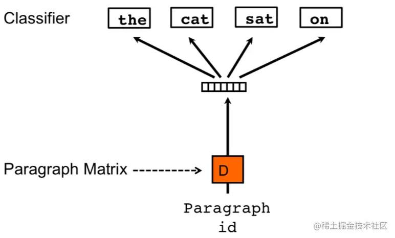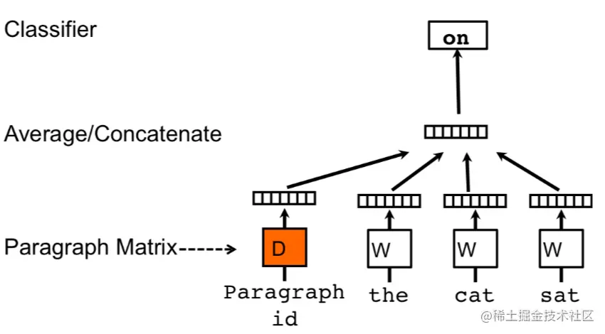 在CBOW的基础上,PV-DM加入了paragraph-id,每个ID对应训练集一个文本,可以是一句话,一个段落或者一条新闻对应。paragraph-id和词一样通过embedding矩阵得到唯一的对应向量。然后以concat或者average pooling的方式和CBOW设定窗口内的单词向量进行融合,通过softmax来预测窗口中间词。