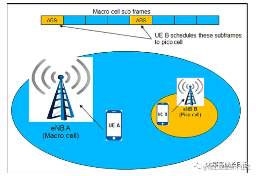 针对以上两种场景的干扰,提出使用eICIC(enhanced Inter-Cell Interference Coordination)进行干扰协调。eICIC一种方式是通过ABS(Almost Blank Subframe),在时域上进行干扰协调的一种方式。例如下图中,Macro Cell在ABS仅发送一些广播信息,如PSS/SSS,小区级参考信号,MIB,Paging,SIB1等,ABS位置留给Pico Cell对用户进行调度。