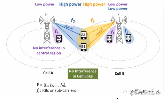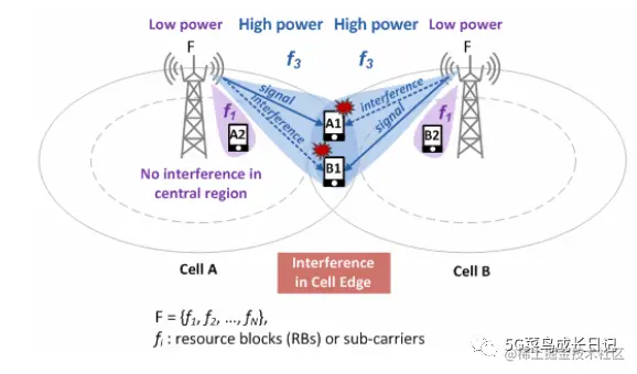 在LTE中,不同用户通过在频域调度不同的RB进行频分复用,例如上图中如果处于小区边缘的分属Cell A和Cell B调度的用户A1和B1,在频域上使用相同的RB位置调度,则会造成比较严重的同频干扰。