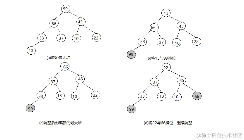 现在的问题变成了如何将剩余的元素重新生成一个最大堆——也很简单,只要依次自上而下进行过滤,使其符合最大堆性质。图(c)是调整后形成的新的最大堆。要注意的是,99已经被排除在最大堆外,即在调整的时候堆中最大元素个数应该减1,结束第1轮调整后,再次将当前堆中最后一个元素22与堆顶元素换位,如图(d)所示,再继续调整成新的最大堆... ... 如此循环直到堆中只剩1个元素,即可停止,得到一个从小到大排列的有序序列。
