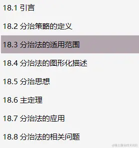 对于第17章列举的许多问题,贪婪策略不能提供最优解。而其中的某些问题可通过分治(Divid and Conquer, D&.C)法来轻松求解。分治法是一种重要的基于递归的算法设计技术,分治算法递归地将问题分解为两个或多个同类型的子问题,直至这些子问题简.单到能够直接求解,然后再将这些子问题的解合成为原始问题的解。